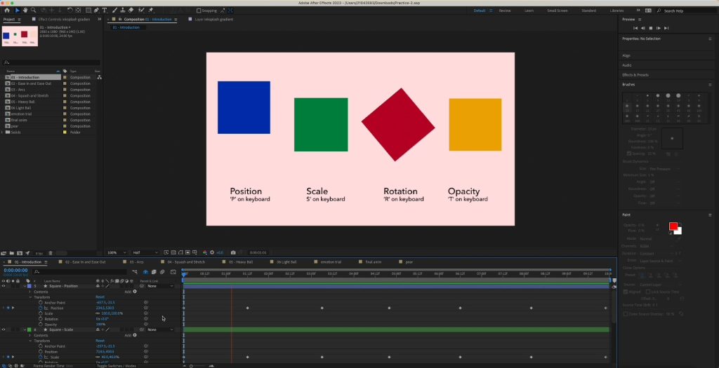 figuring out on how to move the shape through the use of position and rotation whilst also changing the opacity and also changing the size of the shape thorough scale.